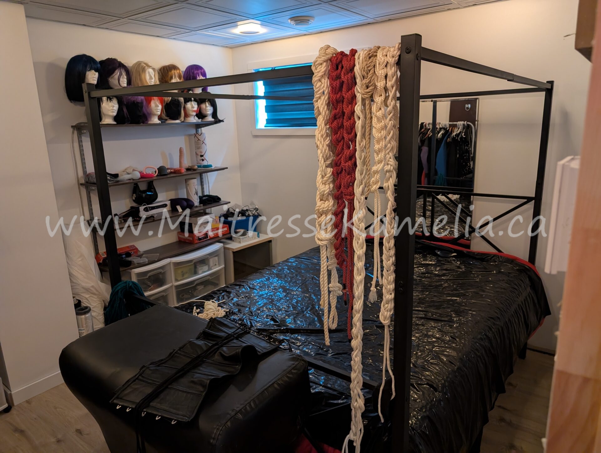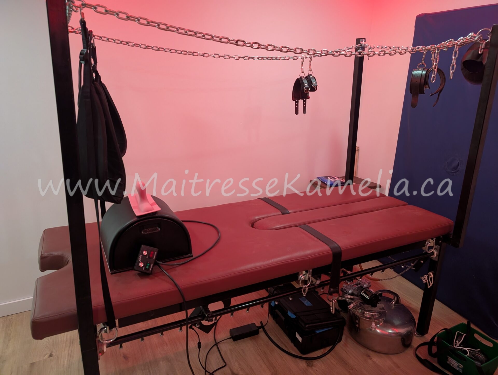 Voici enfin le nouveau donjon de Maitresse Kamelia avec salle de bain adjacente.